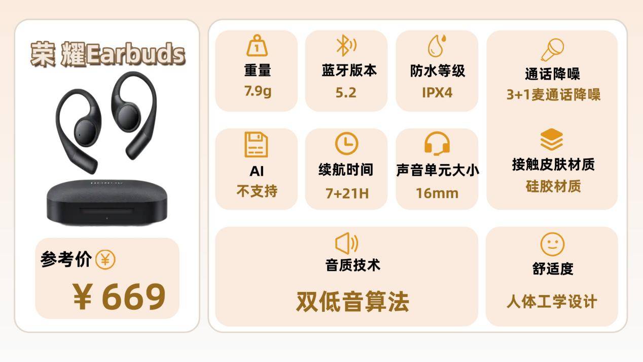开放式耳机推荐八:荣 耀Earbuds(¥669)