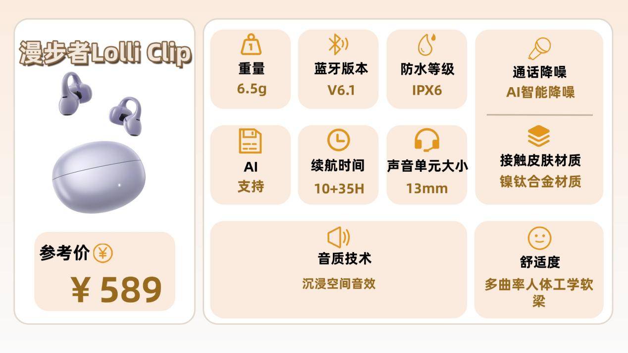 漫步者Lolli Clip配备EDIFIER专利多曲率空气弧仿生结构,设配不同耳廓,强韧镍钛骨架+柔性硅胶外层,单只耳机重量仅6.5g,日常佩戴没什么问题。音质上配备13mm大尺寸镀钛动圈单元,声音更加开阔自然。配置上支持蓝牙6.1,更快、更稳、更省电,在信号复杂的环境,连接稳定出色。