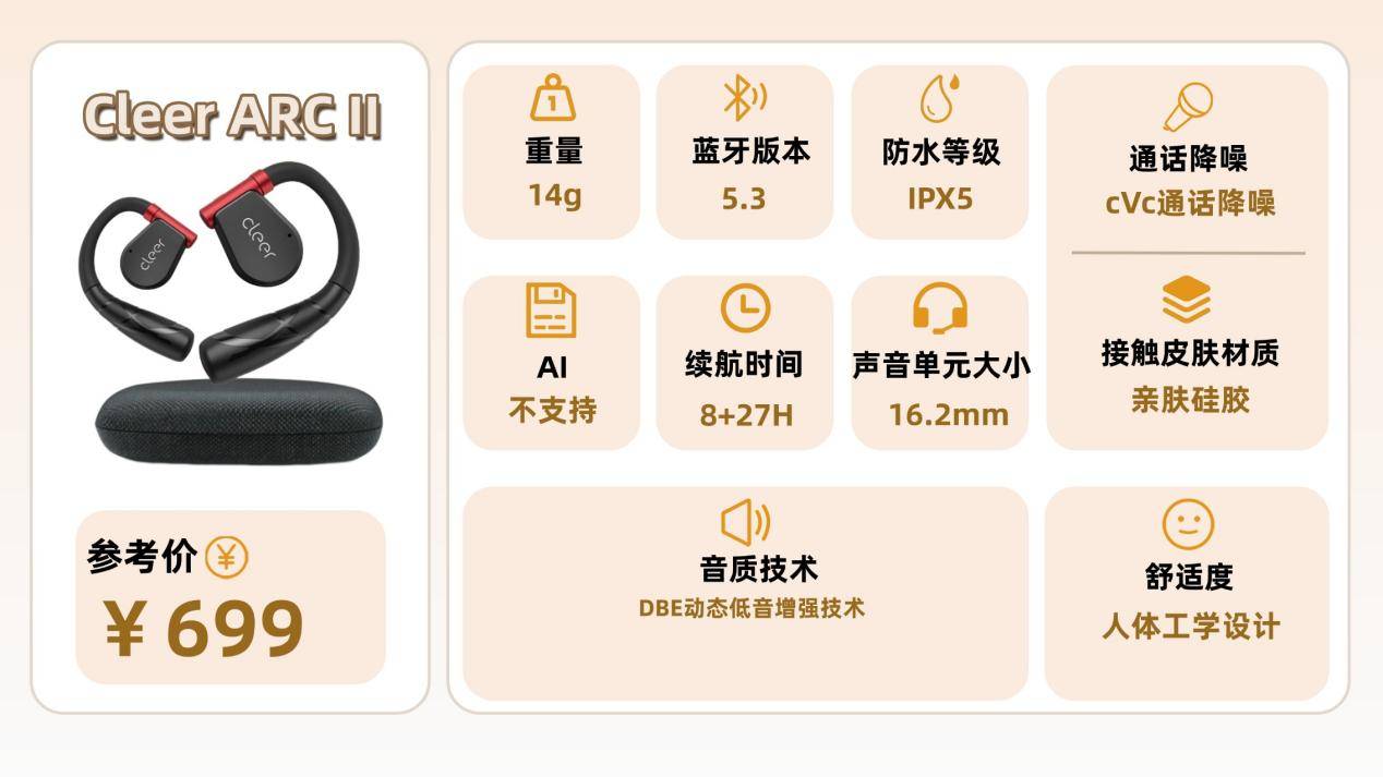 配置方面,Cleer ARC II支持蓝牙5.3,多设备蓝牙双连接,实现无缝切换。同时近4倍更高码率蓝牙传输码,2倍够狠更高宽带,音符原声无损聆听。续航方面,单只耳机巡航8h,搭配充电舱巡航可达35h。