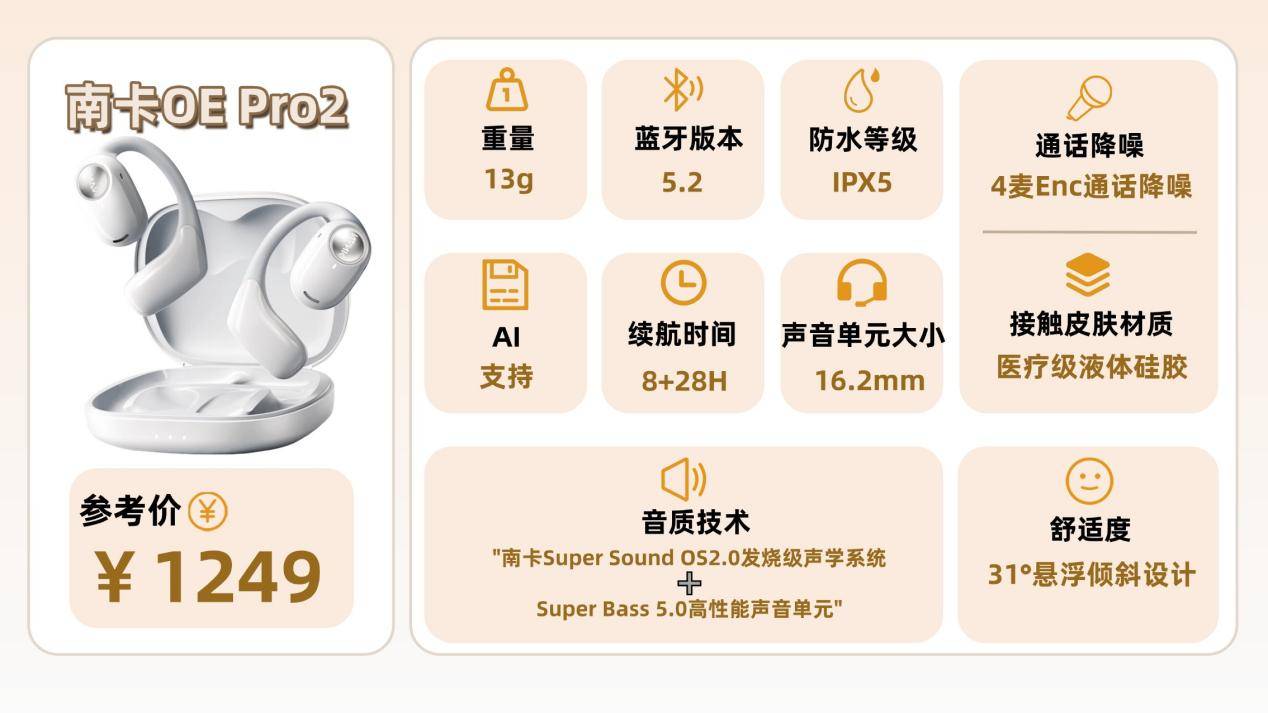 南卡OE Pro2耳机是历经800多天打磨才推出的旗舰之作,只为在音质上做到极致。它采用自研Super Bass 5.0旗舰单元,采用16.2mm巨能量动圈+第六代高弹LCP振膜,带来“大场面+大能量”的声学突破,大振膜释放澎湃低频、鼓点弹性十足,再加上源自南卡13年声学积累的 Super Sound OS2.0发烧级声学系统,算力对比上一代提升150%,实现98.6%音质还原度,带来纯净而个性化的听觉体验,不仅碾压开放式耳机业内,更能媲美千元级入耳式的音质表现,真正登顶开放式HiFi音质天花板。更重要的是,OE Pro2还全面整合讯飞×DeepSeek全栈智慧系统,具备翻译、对话、搜索、创作等数十项功能,让耳机不再只是听音工具,而是全场景智慧助手, 凭借“智慧全能+发烧音质”的双核实力,OE Pro2堪称行业里程碑式的存在。